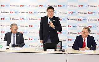 記者会見会場の様子 2025年の抱負を語る髙橋会長 蝦名理事長(左)と池畑理事・事務局長(右)