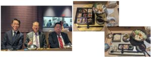 (左:お食事の様子(左/PATA日本支部会員・日本ホテル協会会員 池田様、中/訪日旅行推進委員会 百木田委員長、右/訪日旅行推進委員会 磯委員)、右:メニュー変更も対応可能な和食会席(上/ハラール御膳、下/ヴィーガン会席))