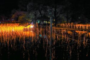 (舞い落ちる火の粉が水面に反射した幻想的な風景)