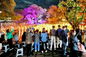 (左:多くのお客様が美しい景観に感動、右:木炭粉を韓紙で編んだ落火棒に点火する様子)