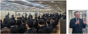 (左:フェアには去年の約2倍となる多くの学生が集まりました 右:冒頭の挨拶をするJATA渡辺正樹次長)